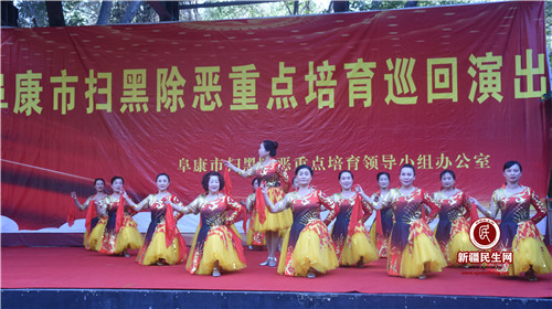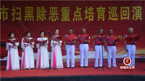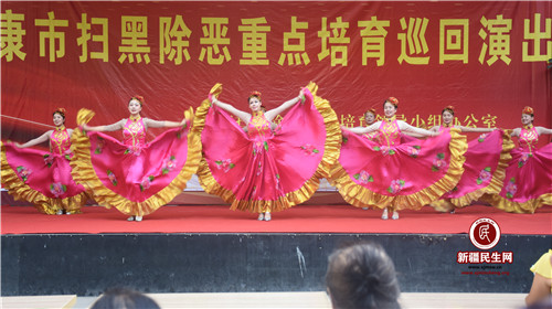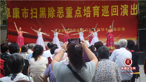 新疆民生网(马芳芳)8月31日,阜康市“扫黑除恶”重点培育巡回演出活动在博峰街道博北路社区精彩上演,街居干部、社区群众150余人进行了观看。
