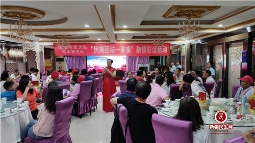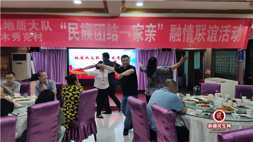 最后的联欢会上,干部职工与亲戚欢聚一堂,载歌载舞。九队职工也为到来的亲戚表演现代舞蹈、葫芦丝演奏、独唱等节目,充分展现了新时代九队人的精神面貌,一曲欢快的麦西莱甫跳出了各民族间血脉相连的情谊。第九地质大队大队长周晓飞说:“大家要感恩党、感恩政府,珍惜亲戚之间的友情、亲情。要把这次来乌鲁木齐看到的、听到的,感受到的,回到村里跟村民多多宣传,建设好美丽庭院,早日脱贫致富,过上幸福的生活,共同建设好美丽的吐木秀克村。“