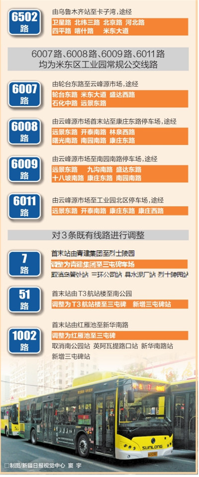 新疆日报讯(记者魏红萍报道)7月22日,乌鲁木齐市交通运输局对公交线网进行年内的第二次优化和调整,新增6502路、6007路、6008路、6009路、6011路等5条线路,其中4条线路为米东区工业园常规公交线路。对7路、51路、1002路3条既有线路进行调整。此次调整和新增线路,正式运行时间均为7月28日零时。